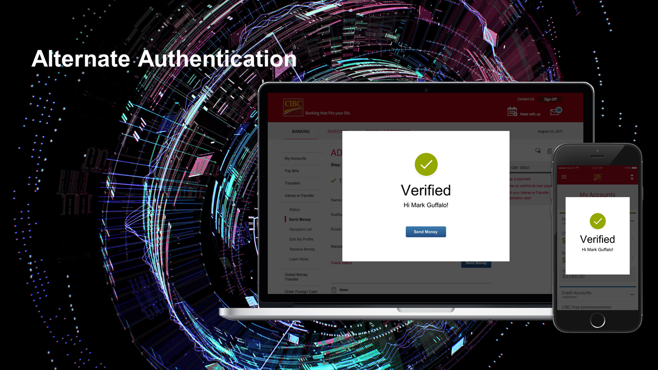 A trusted device security protocol (i.e., a desktop or mobile device that a user registers to their CIBC account) was the main vehicle for our security solution, and was typically the first of two security steps along with either a Touch ID, QR Code, or behavioural biometric-based second step (i.e., the tracking of behavioural patterns such as typing speed in order to ensure the patterns match in the future).