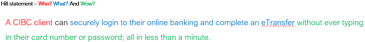 Taking points from the competitive analysis to inspire which new authentication methods would provide a good user experience, and in consultation with the client security team as to what is feasible from a security standpoint, a prototype was built that responded to the following hill statement: