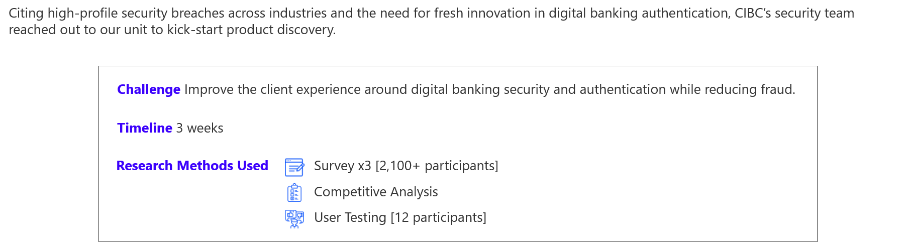 The team’s designer and I devised multiple scenarios that would use our new security protocols within a prototype for user testing. While the prototype was being developed, I created a testing plan to probe the understanding and expectations of our users. Once completed, I ran guerilla-style user testing on CIBC clients at a nearby branch.